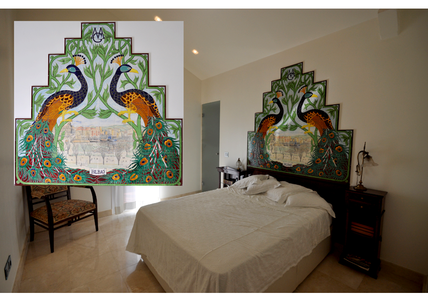 Tête de Lit aux Paon et vue de Bilbao Tête de lit. Sous couverte, corde sèche et émaux. Vue de l'aqueduc enneigée de Ségovie depuis le "Postigo". Relief, cloisonné, corde sèche y émaux.